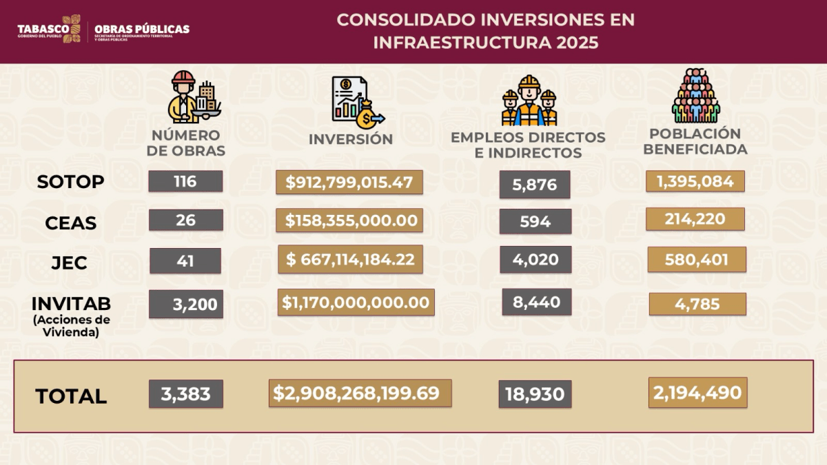 El Gobierno del Pueblo ha destinado 2 mil 908 millones 268 mil 199 pesos en infraestructura durante los primeros meses de 2025, lo que ha generado más de 18 mil 930 empleos directos e indirectos en beneficio de 2 millones 194 mil 490 tabasqueñas y tabasqueños, informó el titular de la Secretaría de Ordenamiento Territorial y Obras Públicas (SOTOP), Daniel Arturo Casasús Ruz.