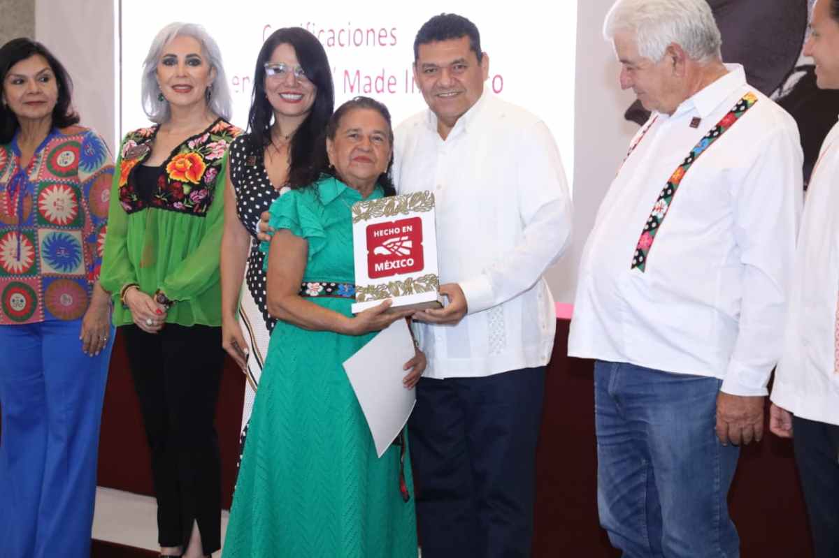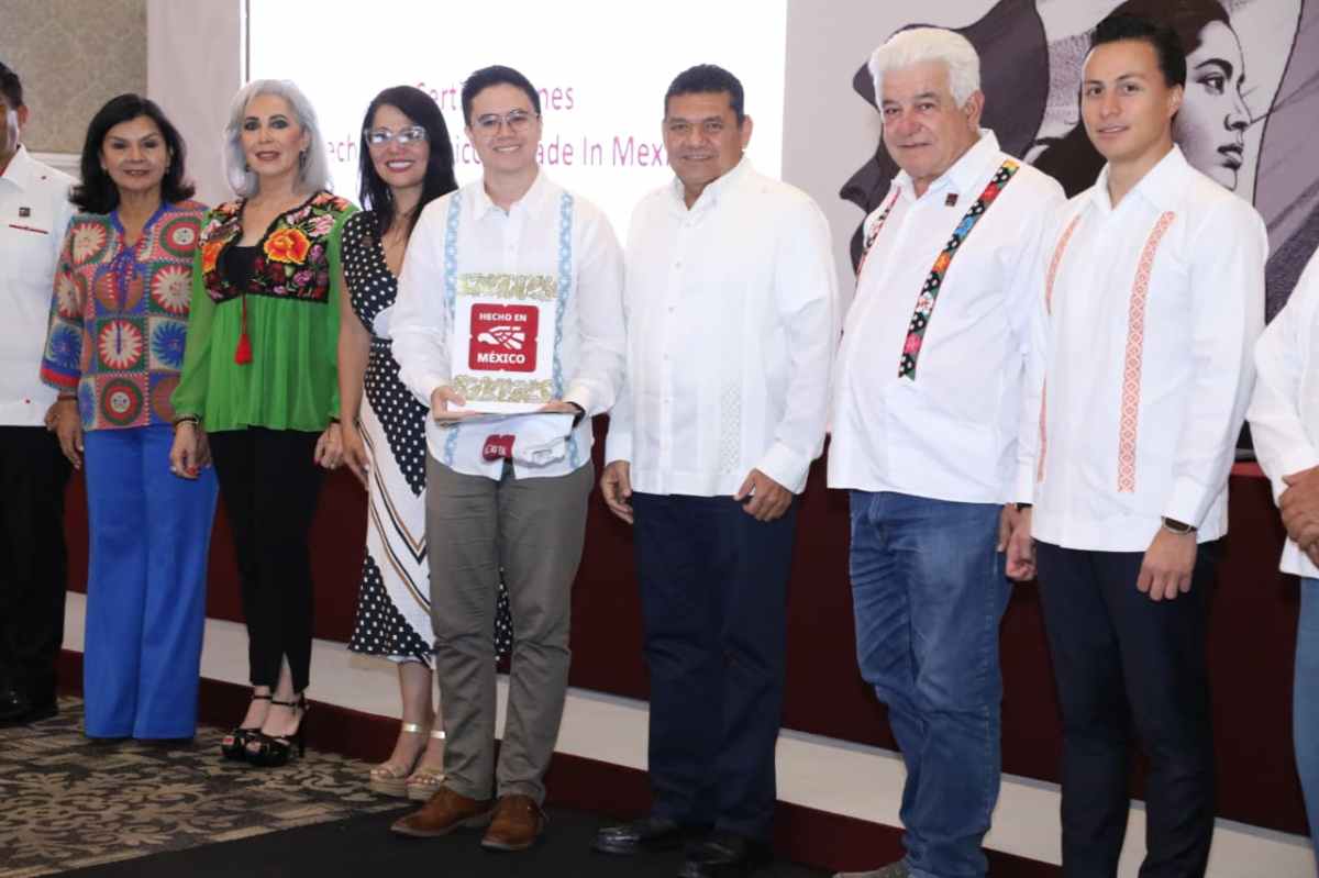 Durante el evento, el mandatario estatal recibió el distintivo ‘Hecho en México’ por parte de María Bárbara Botello Santibáñez, representante del Plan de Marca Nacional, como reconocimiento a su impulso a la producción local.
