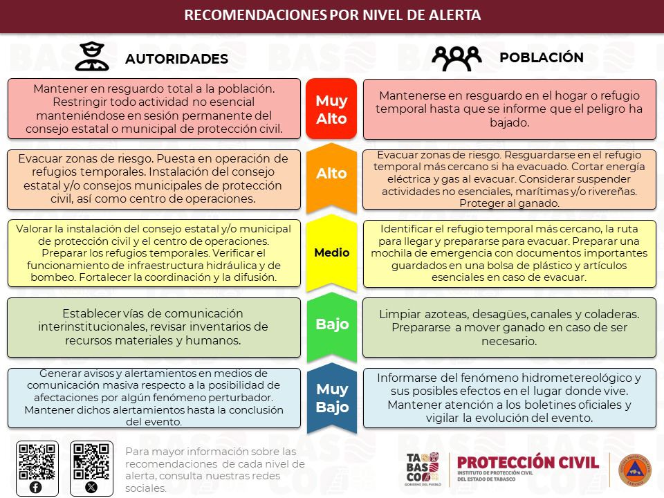 De acuerdo con el organismo, las precipitaciones podrían generar encharcamientos, desbordamientos de ríos y afectaciones en zonas bajas, por lo que se exhorta a la población a mantenerse informada a través de canales oficiales y seguir las recomendaciones de Protección Civil.