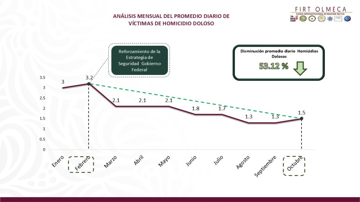 De acuerdo con el Informe de Seguridad presentado durante la conferencia matutina del gobernador Javier May Rodríguez, el homicidio doloso se redujo 53 por ciento al pasar de un promedio de 3.2 casos diarios en febrero a 1.5 en octubre de este año.