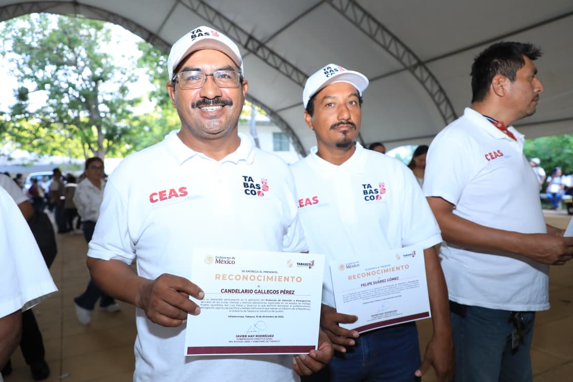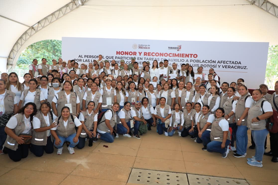 El gobernador Javier May Rodríguez encabezó la entrega de reconocimientos a más de 700 trabajadores y elementos de las Fuerzas Armadas que participaron en las labores de auxilio a la población afectada por las lluvias registradas en octubre pasado en Hidalgo, Puebla, Querétaro, San Luis Potosí y Veracruz.