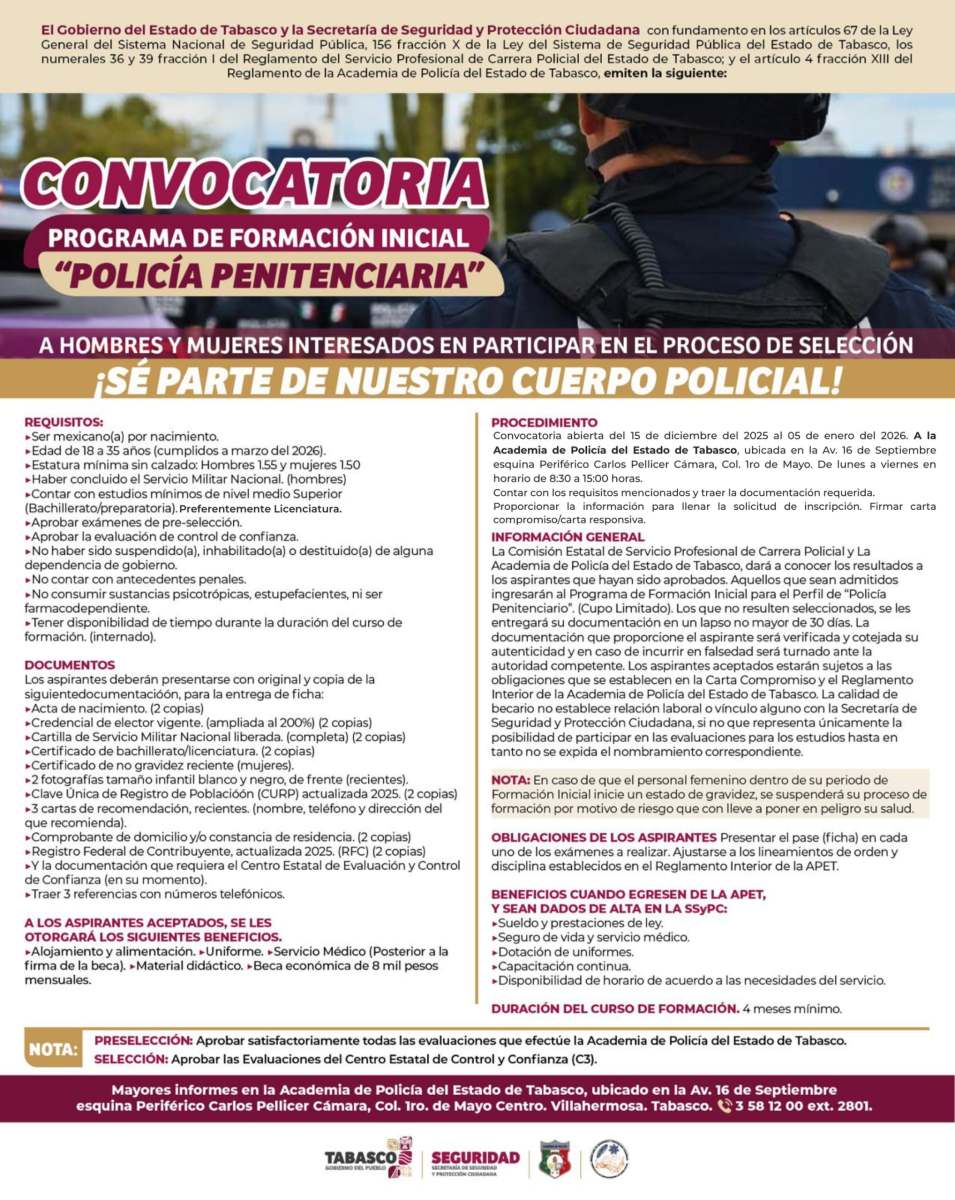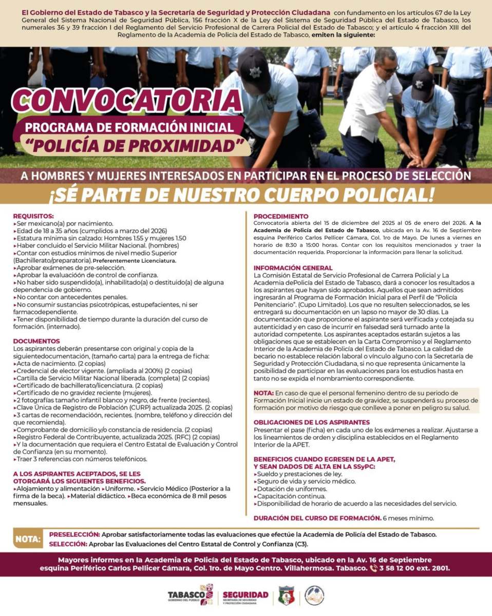 La dependencia destacó que ser policía implica asumir una responsabilidad con la legalidad, el orden y la protección de las familias tabasqueñas, por lo que invitó a quienes cumplan con el perfil a formar parte de una institución sólida y profesional.
