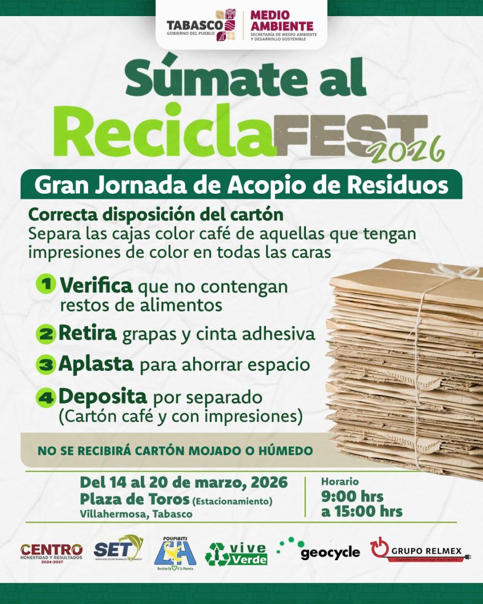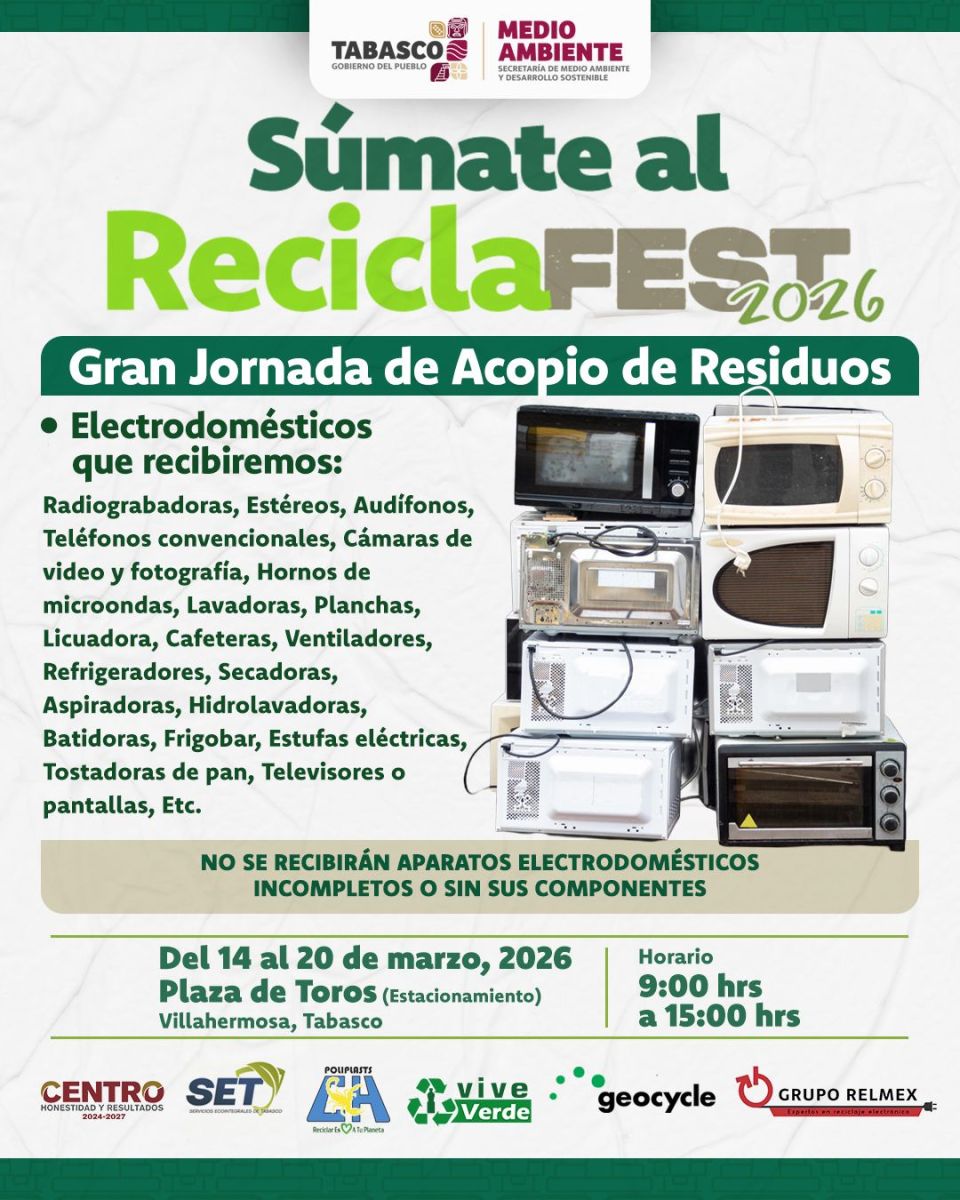 Con el objetivo de fomentar la conciencia ambiental y promover una gestión adecuada de los residuos, el Gobierno del estado realizará del 14 al 20 de marzo el “Recicla Fest 2026”, una campaña de acopio impulsada por la Secretaría de Medio Ambiente y Desarrollo Sostenible de Tabasco (SEMADES).