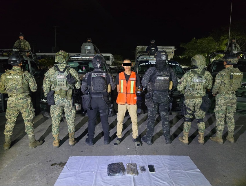 En otro operativo en Centla, elementos de seguridad detuvieron a un hombre que transportaba aproximadamente 88 kilogramos de marihuana en cinco cajas y doce bolsas dentro de un tractocamión tipo rabón con caja seca.