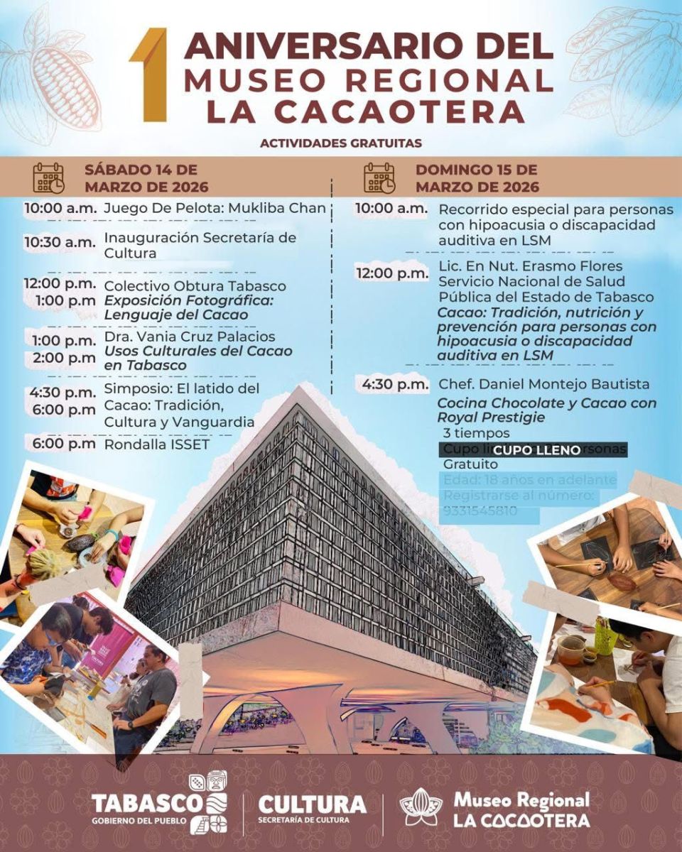 De igual forma, el Museo Regional La Cacaotera celebrará su primer aniversario con actividades especiales, entre ellas una exposición fotográfica, un simposio dedicado al cacao y presentaciones musicales.