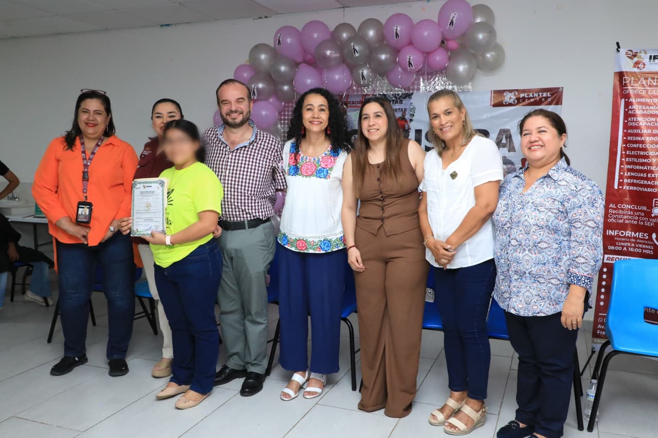 La presidenta honoraria del Sistema DIF Tabasco, Aurora Raleigh de la Cruz, encabezó la entrega de constancias de capacitación a 12 menores bajo custodia de la Casa Hogar, quienes concluyeron cursos impartidos por el Instituto de Formación para el Trabajo de Tabasco.
