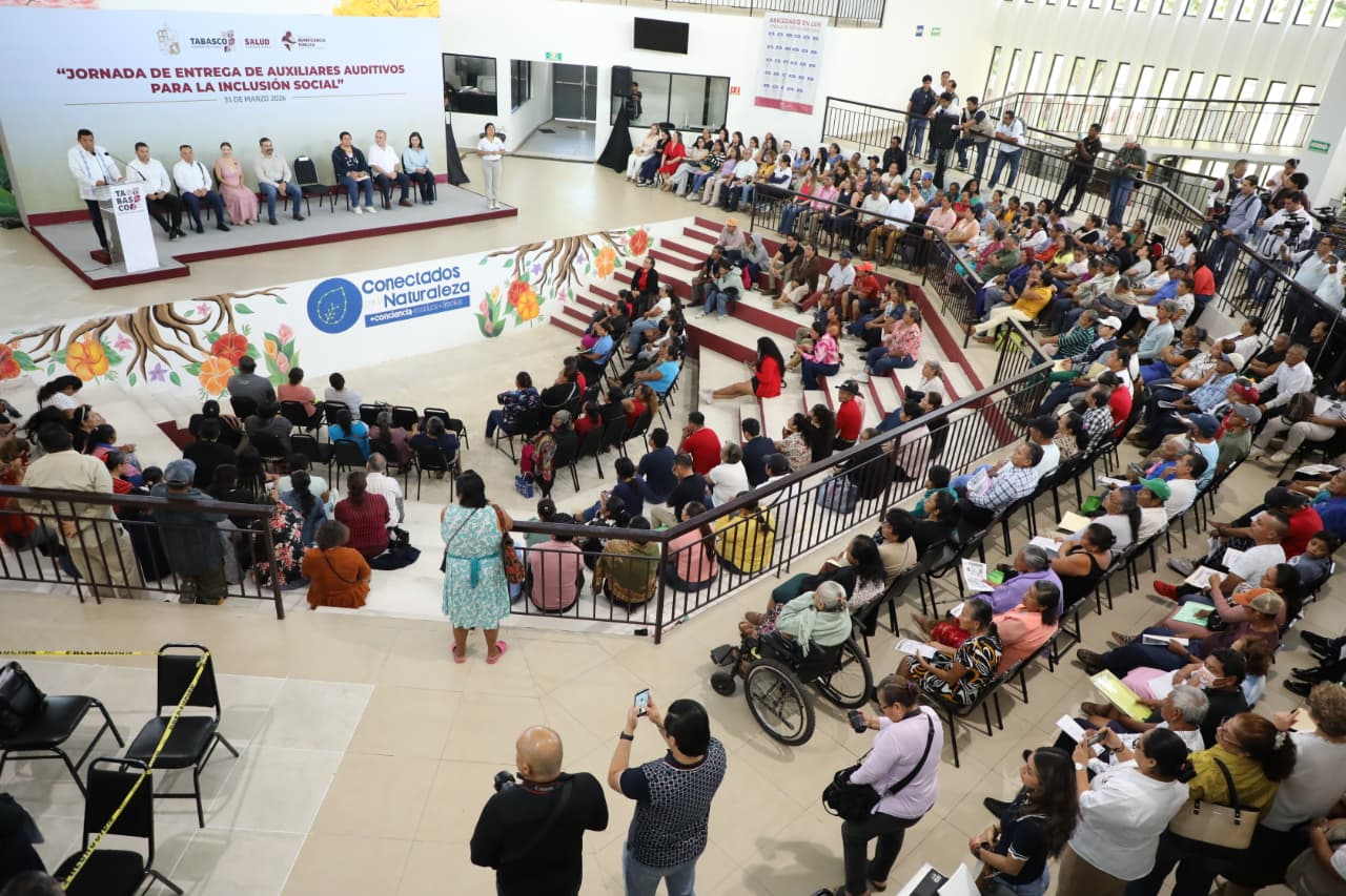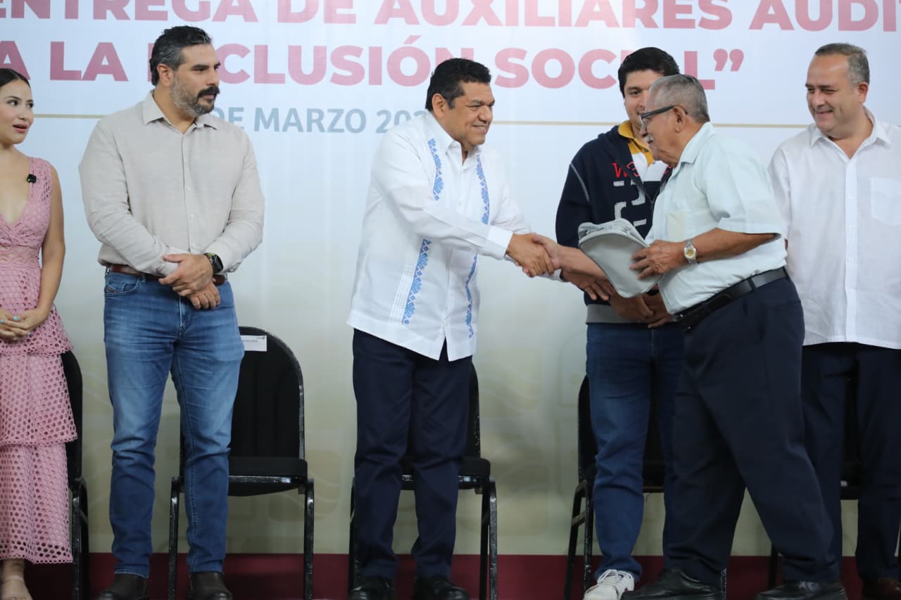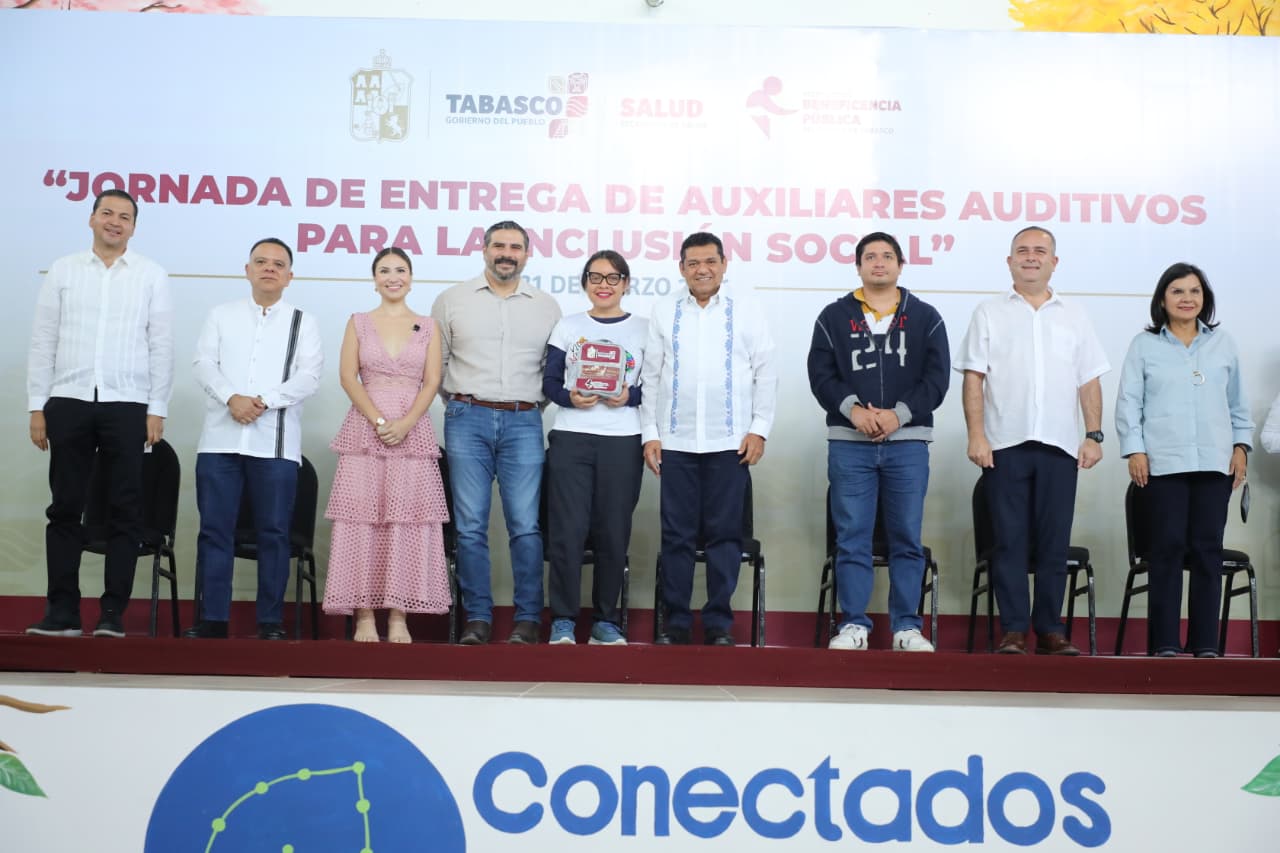 El gobernador de Tabasco, Javier May Rodríguez, encabezó la entrega de 420 auxiliares auditivos gratuitos como parte de una estrategia para mejorar la calidad de vida de personas con discapacidad auditiva.