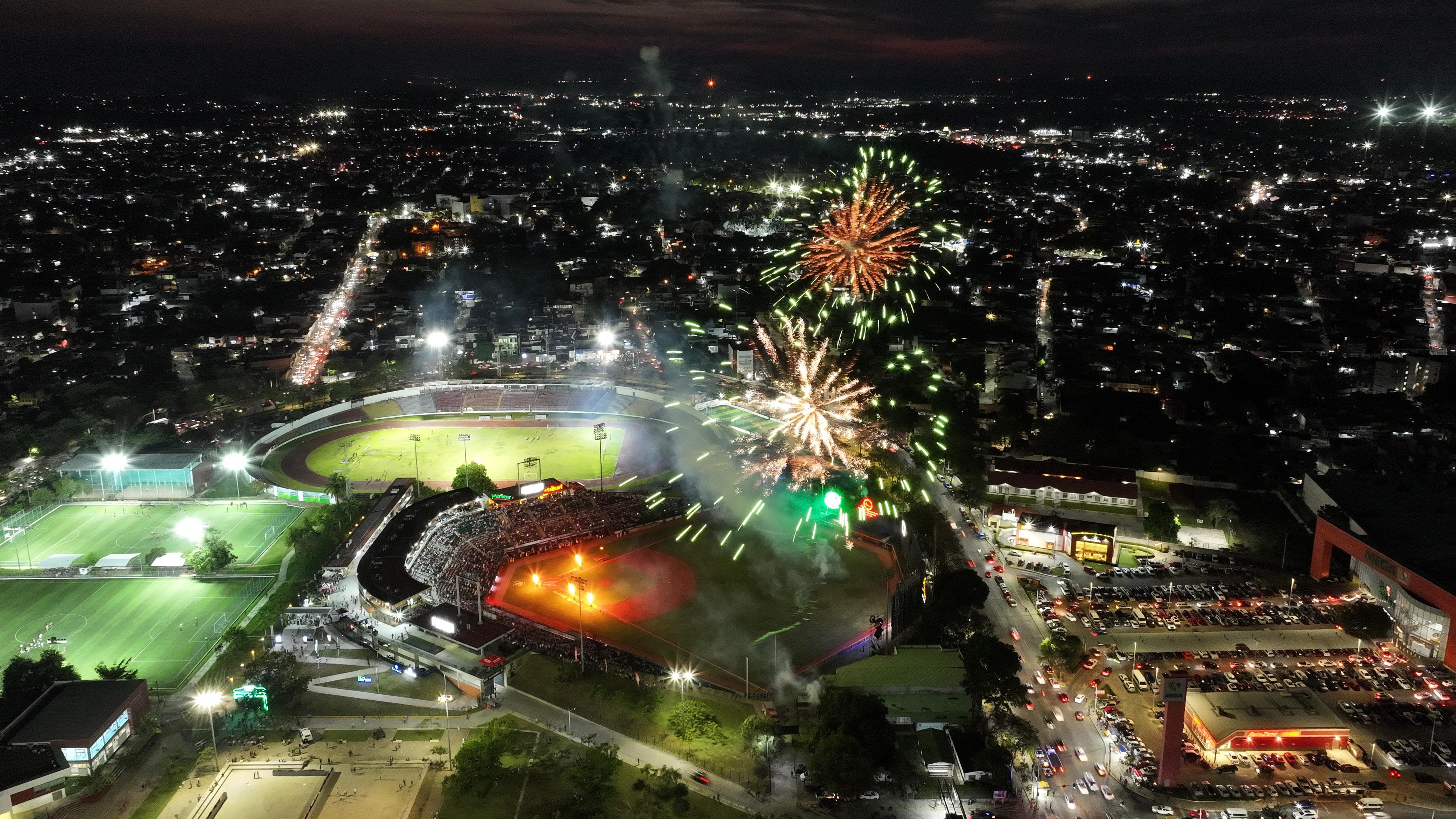 Previo al “play ball”, los asistentes disfrutaron de un espectáculo de drones y fuegos artificiales que iluminó el cielo de Villahermosa, además de los honores a la bandera con la participación de elementos de las fuerzas armadas.
