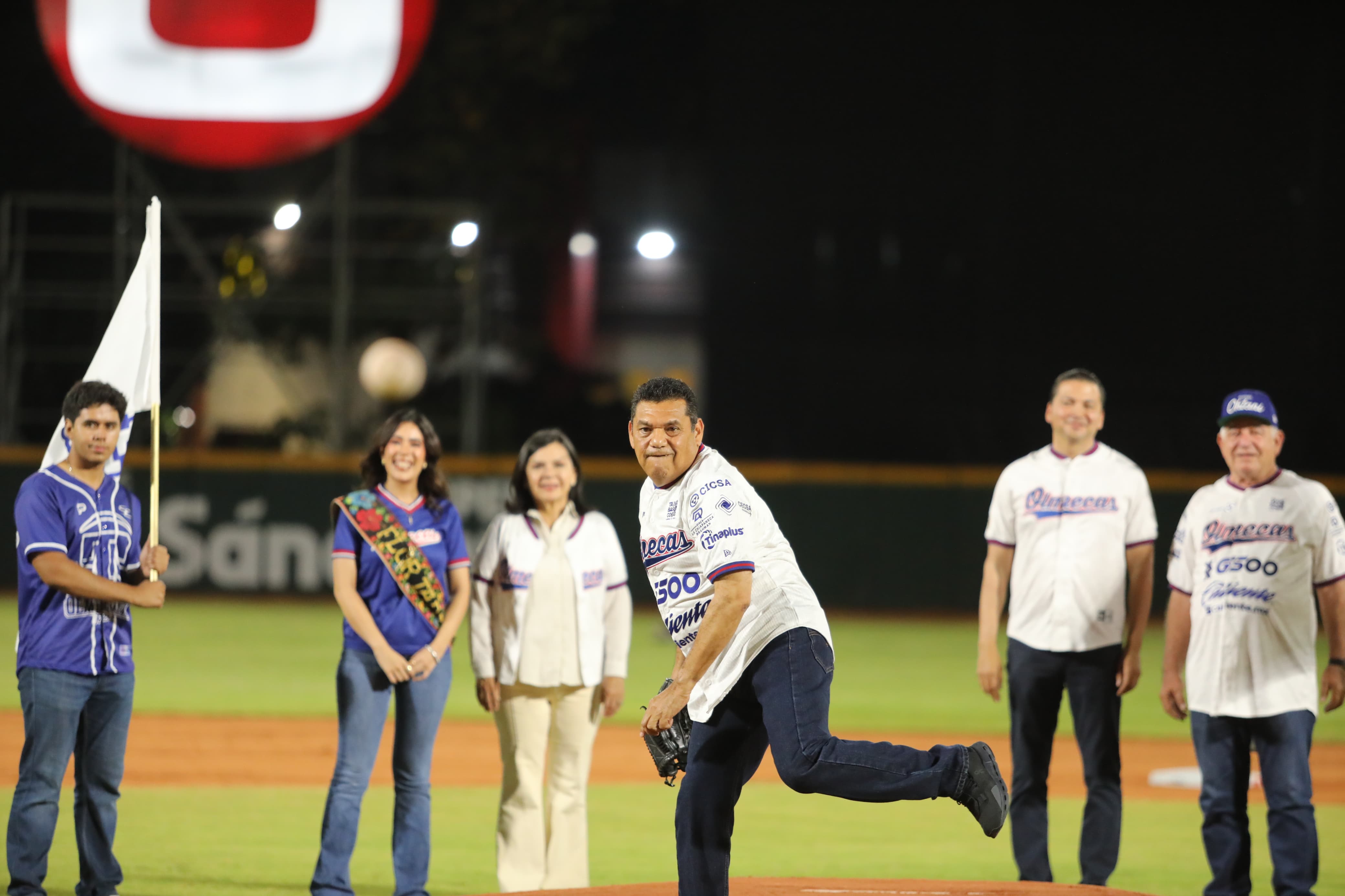 El arranque contó con la presencia del gobernador de Tabasco, Javier May Rodríguez, quien lanzó la primera bola desde el diamante, acompañado por el presidente ejecutivo del club, Daniel Gómez Arellano, y la Flor de Oro Tabasco 2025, María Fernanda Palma Miramontes. Como receptor participó el jugador local Alan Espinoza.